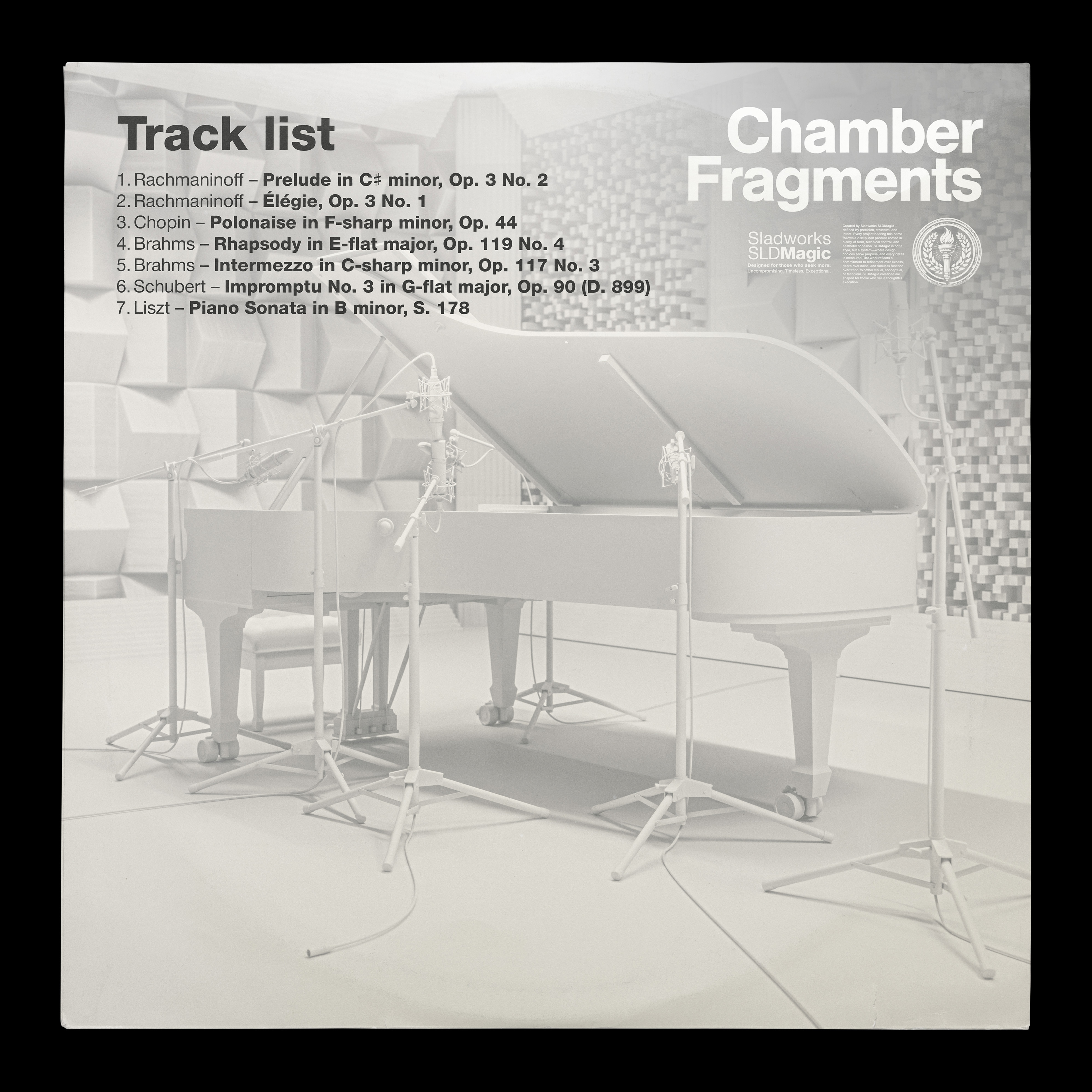 Chamber Fragments is a curated piano program built around late-Romantic repertoire, moving from the weight and density of Rachmaninoff toward the large-scale structure of Liszt’s Sonata in B minor. The sequence follows a gradual shift in form and intensity, passing through Chopin’s instability, Brahms’ inward writing, and Schubert’s suspended lyricism.