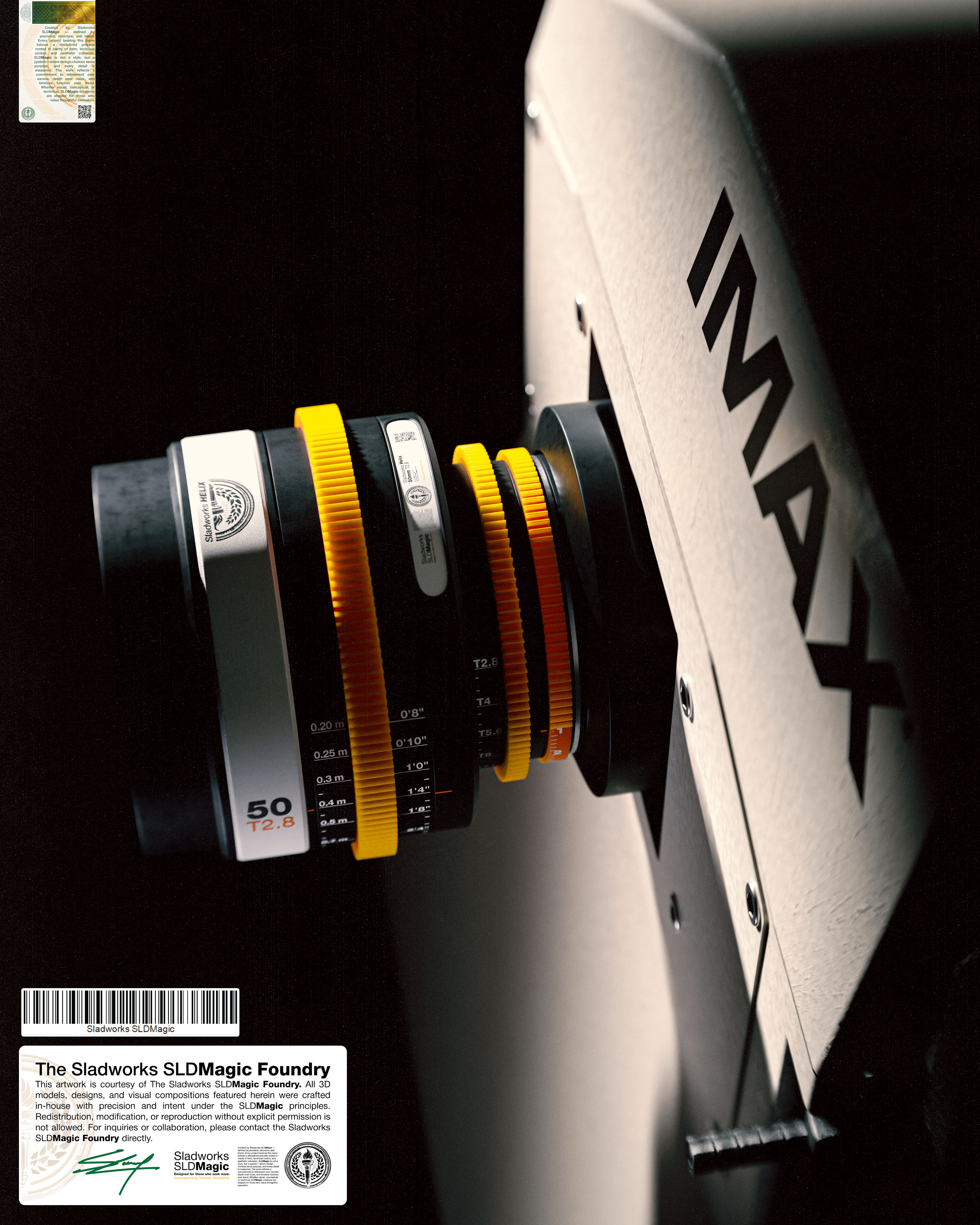 IMAX MSM 9802 and Sladworks Helix 50mm prime lens concept. Created and rendered in Blender Cycles. Compositing stage done in Adobe Photoshop.
