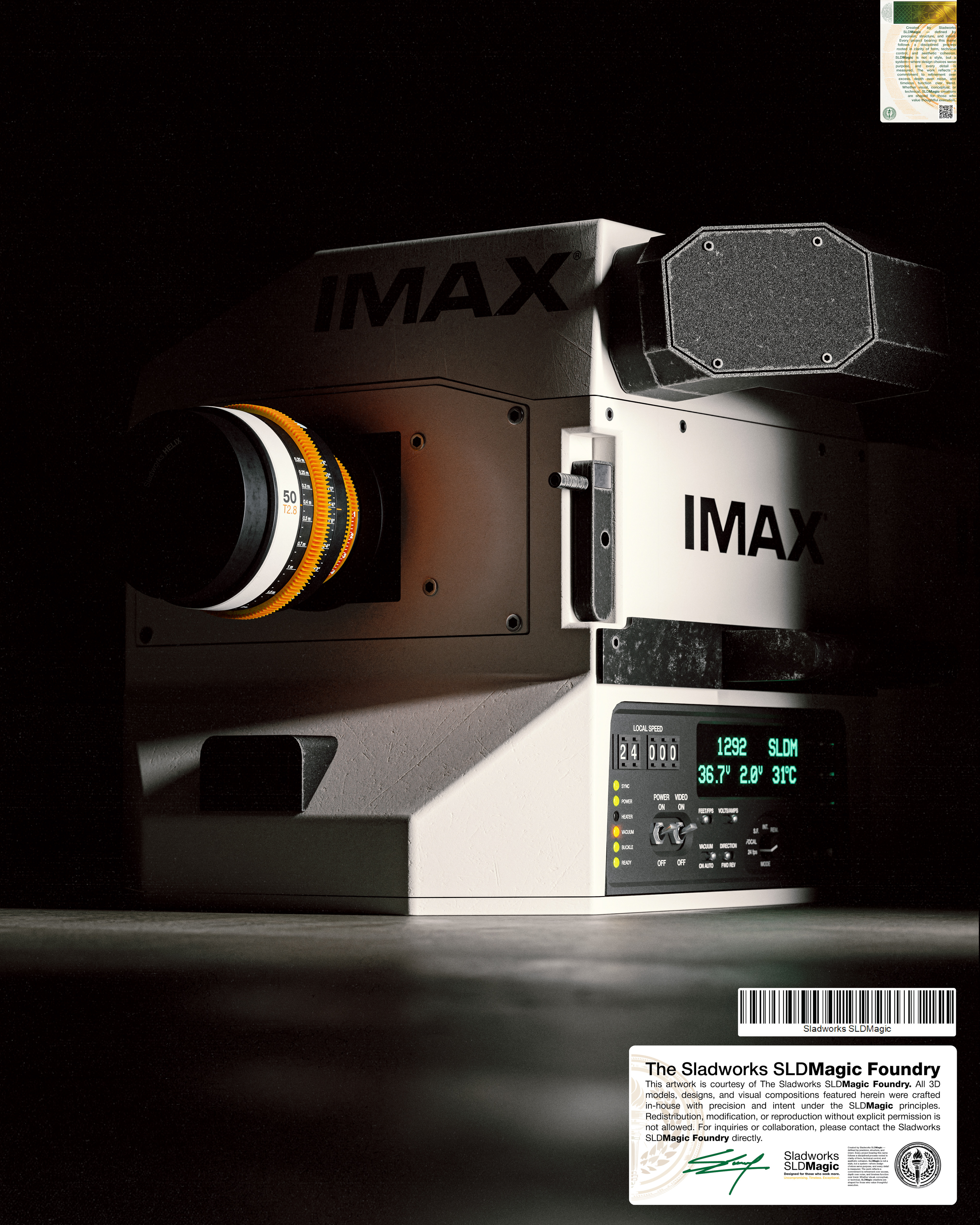 IMAX MSM 9802 and Sladworks Helix 50mm prime lens concept. Created and rendered in Blender Cycles. Compositing stage done in Adobe Photoshop.