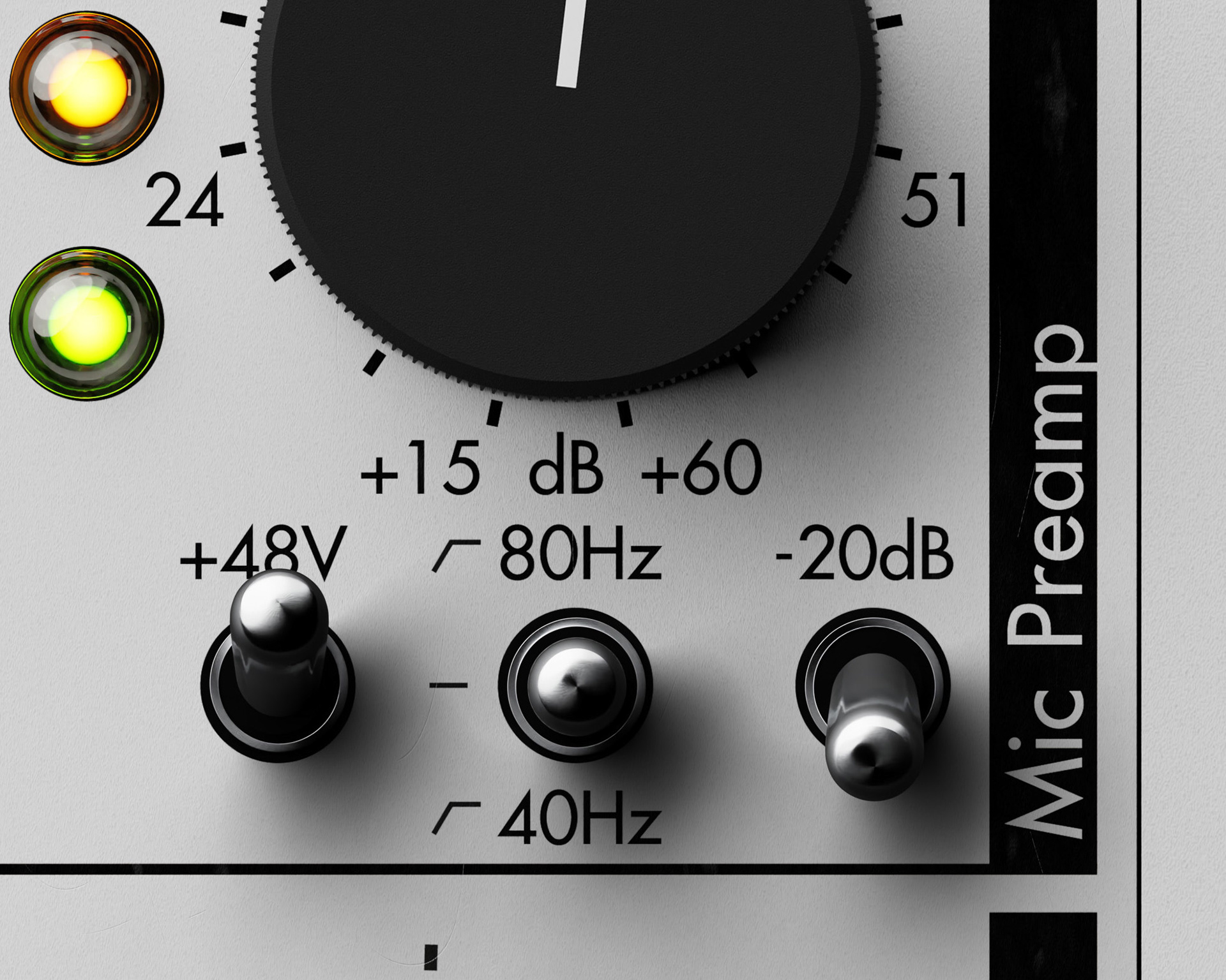 Particular attention was given to the contrast between surfaces: the matte painted faceplate, the denser black finish of the knob, the gloss and internal glow of the indicator lenses, and the harder reflections of the metal switch elements. Small differences in sheen, shadow falloff, and edge response were used to create separation between components and to make each part feel physically distinct.